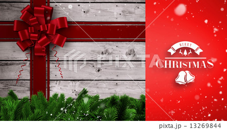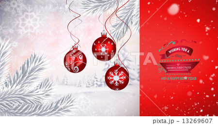 Festive Holiday Arrangement. Christmas ornaments and pine branches on a wooden background