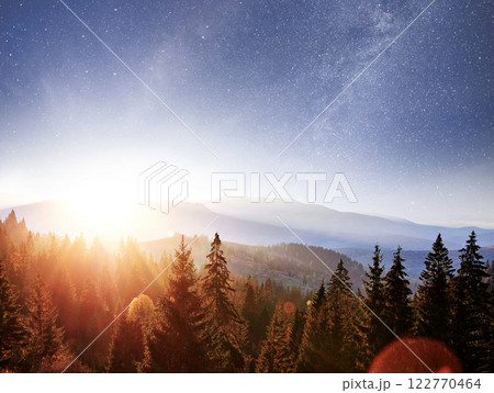 Mountain autumn landscape. High grass and vibrant night sky with stars and nebula and galaxy. Deep sky astrophoto