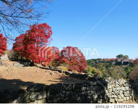 岡城跡の石垣と赤い紅葉 (大分県竹田市)