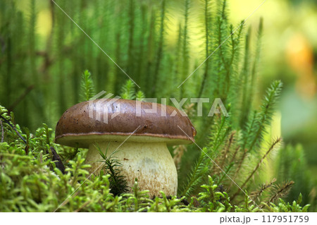 Close-up of a bay bolete mushroom growing on a mossy forest log