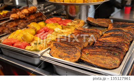 Assorted grilled vegetables and meats displayed on trays at a market stall National Brisket Day