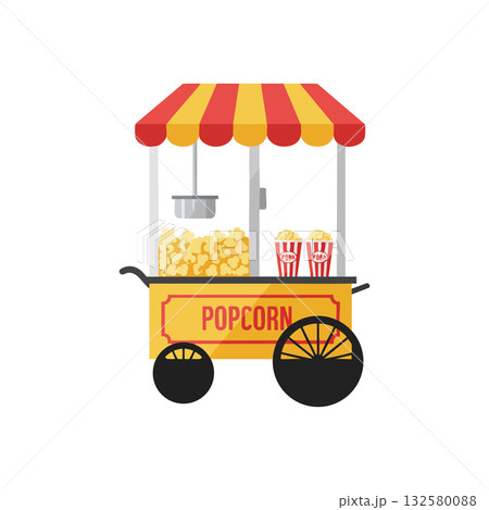 Popcorn cart with striped red and yellow canopy selling fresh popcorn snacks at events and fairs vector illustration