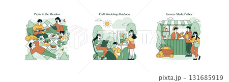 Vector illustration set depicting group enjoying a picnic, engaging in a craft workshop outdoors, and exploring a farmers market. Scenes capture leisure, creativity, and community interaction.