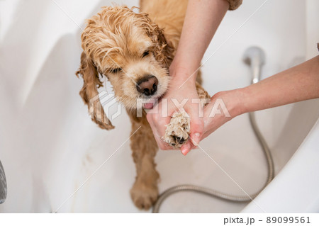 Groomer washing paw of american cocker spaniel standing in bathroom
