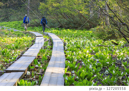 初夏の早朝、戸隠森林植物園に咲き誇る水芭蕉と続く木道の風景