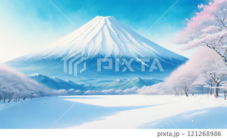 《山梨県》冬の富士山・雪景色の忍野村新名庄川