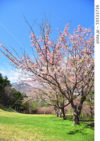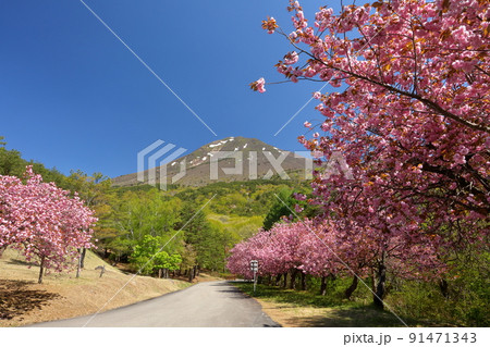 福島県耶麻郡猪苗代町長田天鏡台 昭和の森天鏡台の八重桜関山並木と残雪の会津磐梯山の景色