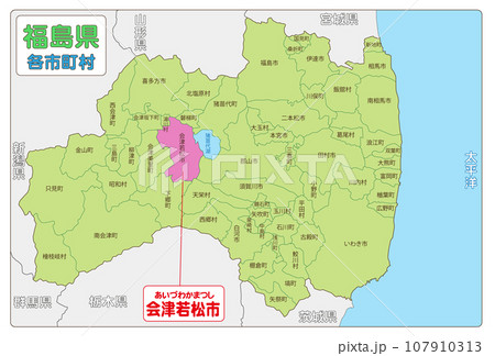 きれいな海と福島県の地図。日本の東北地方の地図より。(市町村の名前)