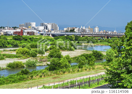 日本の東京都市景観 6月…二子玉川駅近くの多摩川などを望む=8日
