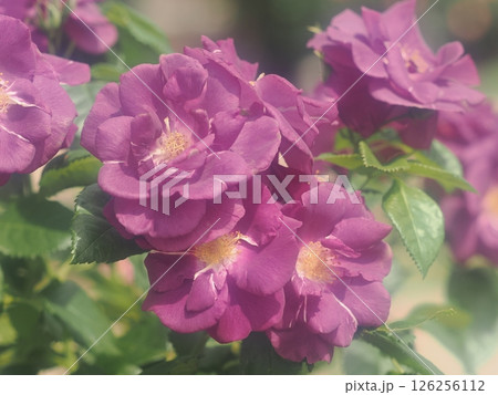 Rosa Rhapsody in Blue modern shrub rose with striking purple violet flowers and yellow white centers blooming in a summer garden with green foliage.