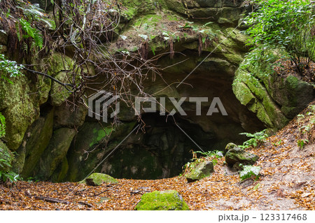 Misty Cave Interior with Towering Rock Formations and Lush Greenery Surroundings