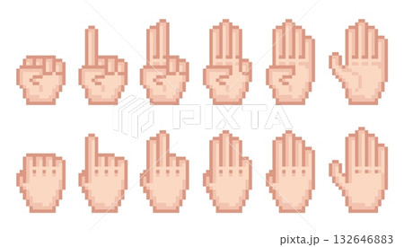 Pixel art fingers counting. Human palm on both sides, count from zero to ten, 8 bit hands icons, retro games assets, communication signs, numbers qualitative vector cartoon isolated set
