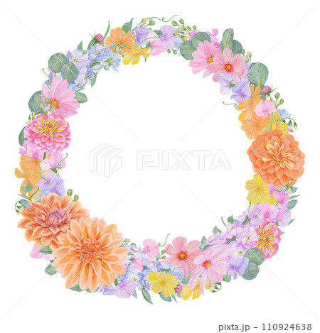 Watercolor botanical colurful round frame of summer and autumn flowers: dahlia, zinnia, lathyrus, gillyflower, nasturtium, cosmos. Good for wedding print products, paper, invitations, greetings
