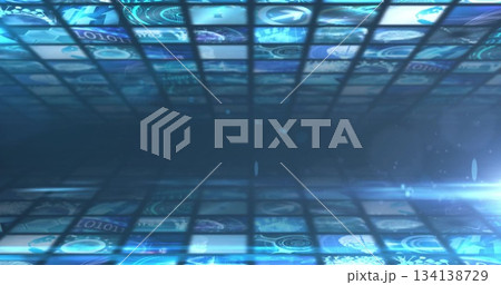 Forming receding digital grid extending through virtual tunnel, with glowing screens and data icons