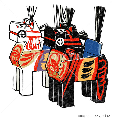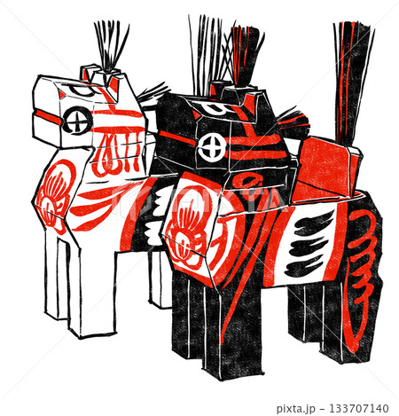 伝統工芸品の三春駒の黒駒と白駒 版画風・赤と黒