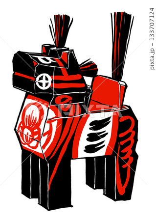 伝統工芸品の三春駒の白駒 版画風・赤と黒