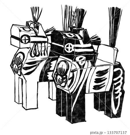 伝統工芸品の三春駒の黒駒と白駒 版画風・白と黒