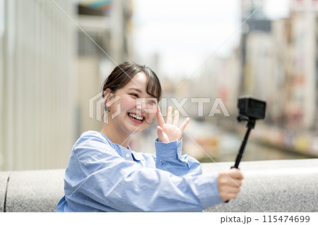 都会の繁華街で自撮り撮影をする若くて可愛い女性|大阪観光イメージ|大阪府道頓堀|戎橋(えびすばし)