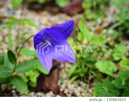 雨上がりの散歩道に咲く紫色の桔梗。