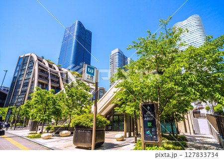 日本の東京都市景観8月。虎ノ門ヒルズステーションタワー(虎ノ門ヒルズ駅)などを望む。新時代へ=15日