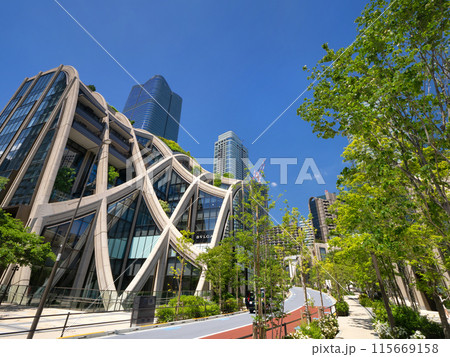 日本の東京都市景観 緑が映える新名所・麻布台ヒルズなどを望む。左は東京タワー