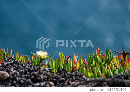 Coastal flora thrive on rugged rocks with a bright flower standing out against the sea.