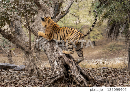 wild male bengal tiger or panthera tigris with tail up climbing hugging body on tree trunk tail up scratching bark of tree showing dominance territory marking behavior ranthambore national park india