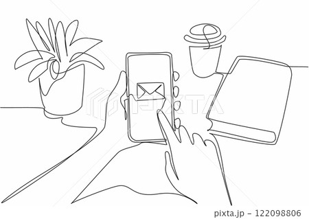 Continuous one line drawing hand looking at email logo from smartphone. Technological advancement. Replying emails from mobile phones. National Email Day. Single line draw design vector illustration