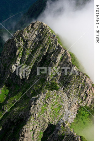 北アルプス・北穂高岳の登りから見る雲湧く大キレットと長谷川ピーク