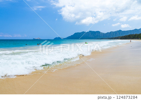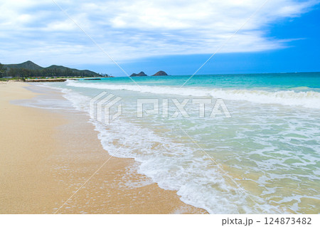 ハワイの休日 青空と海と白い砂浜 オアフ島ベローズビーチから望むモクルア島