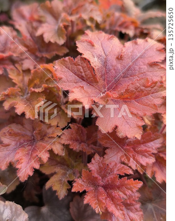 Close-up of autumn heuchera leaves in warm brown and orange tones, natural fall foliage background