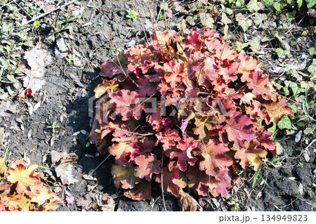 Perennial in the garden. Brightly colored leaves of Heuchera , young beautiful leaves