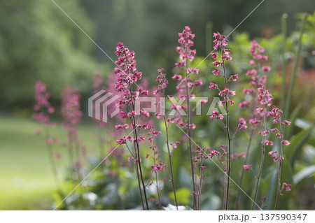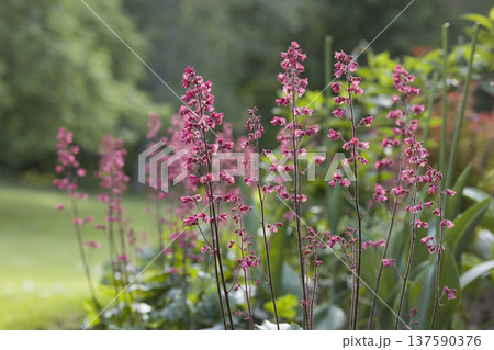 Beautiful pink flowers Heuchera bloom in a vibrant garden during a sunny day in early summer