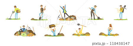 Man Character Treasure Hunter with Shovel and Pickaxe Vector Set