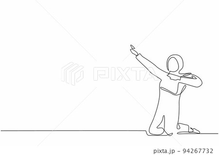 Single continuous line drawing of young beauty Arabian worker lifting hands up to the sky. Professional businesswoman. Minimalism concept dynamic one line draw graphic design vector illustration