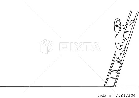 Single one line drawing of young smart Arab business woman climb the ladder up carefully, metaphor. Business growth minimal concept. Modern continuous line draw design graphic vector illustration