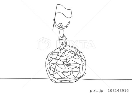 Single continuous line drawing of Arabian businesswoman standing on giant tangled circle. Raising flag on her hand. Businesswoman who manage to get out of anxiety of mind. One line design vector