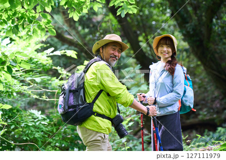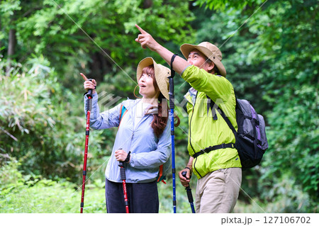 ハイキングをするミドル夫婦