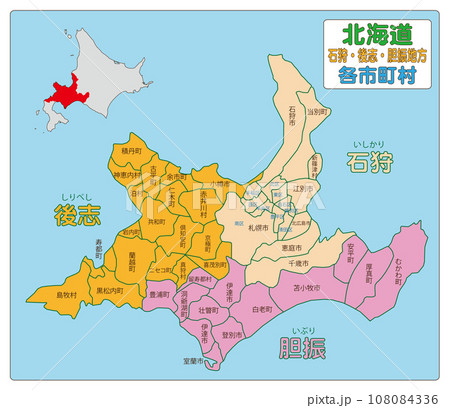 日本の北海道の主な都市など地名付の地図(市町村や地域区分を線で描いている地図)