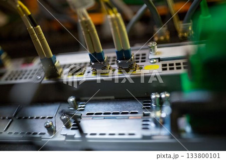 Flat design is showing LC fiber optic cables connecting into network patch panel chassis in rack