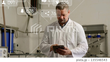 Lab coat technician using tablet in plant, with pipes, cables, notifications, blue filter housings