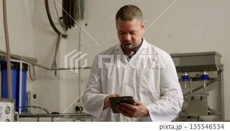 Inspecting equipment technician wearing lab coat using tablet in facility, with filter housings