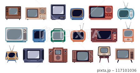 Retro televisions. Tube vintage communication systems, small glass convex screens, wide wooden and plastic housings, nostalgia technology cartoon flat isolated illustration, nowaday vector set