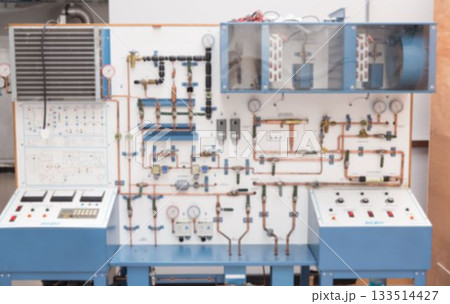 Mechanical training panel is showing copper pipes, gauges, consoles, clear housings in flat design