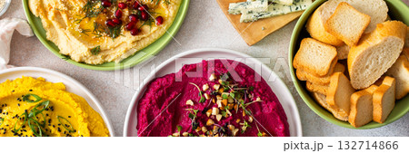 A colorful charcuterie board features beetroot hummus, classic hummus, broccoli hummus, and turmeric hummus, garnished with toppings, surrounded by bread and olives, banner