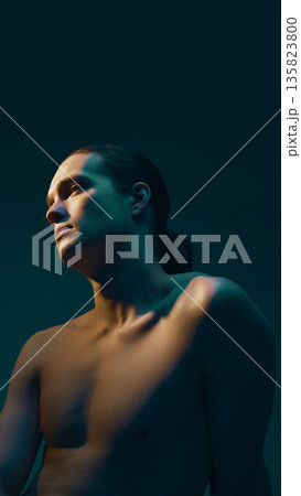 Male nude torso portrait in side light with calm expression.