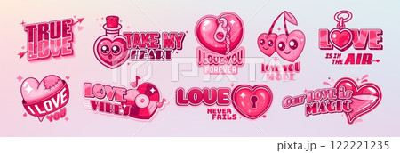 Y2k valentine icons featuring playful pink hearts, romantic messages like true love, take my heart and love you more with vibrant typography, charming and adorable motifs expressing love and affection