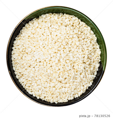 Top view closeup of freshly harvested white sesame in wooden bowl isolated on white background with clipping path.