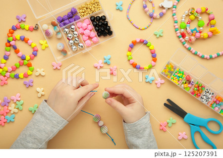 Little girl made bracelets on beige background. Kids handmade beaded jewelry. DIY bracelet beads.