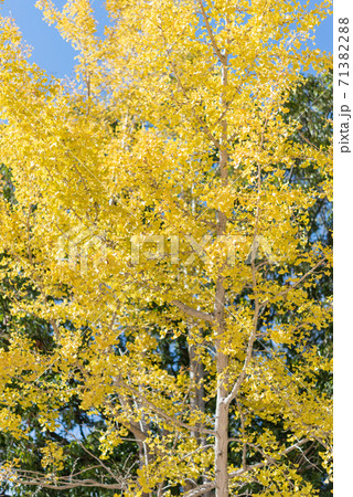 大きなイチョウの木を見上げた秋空のイメージ素材